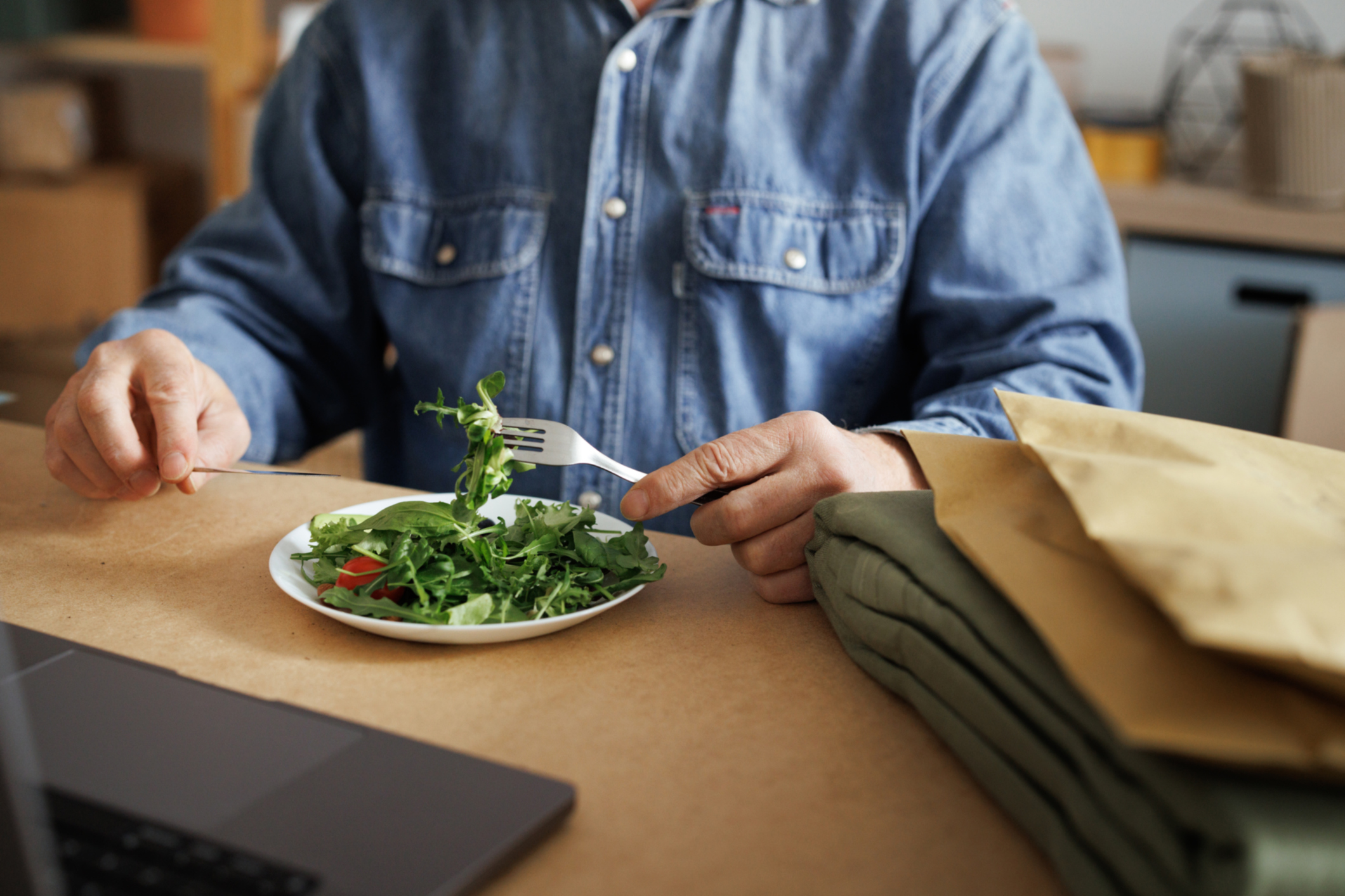 Unrecognizable senior man eating salad while working at home